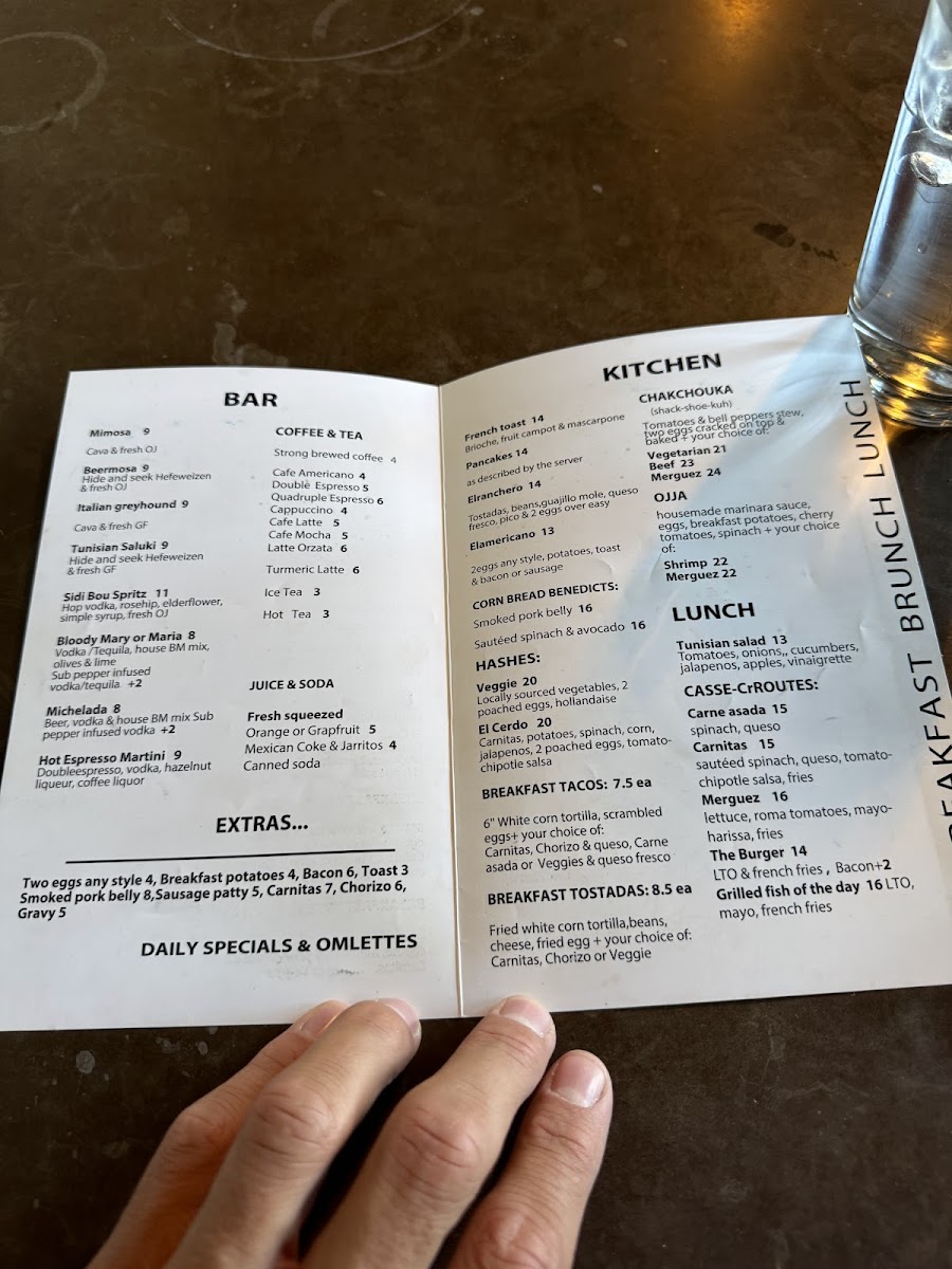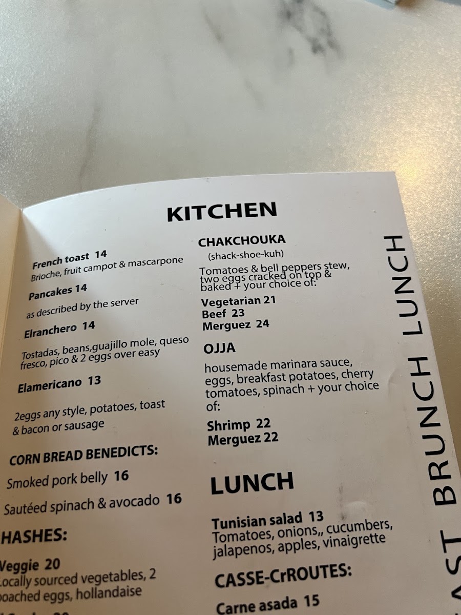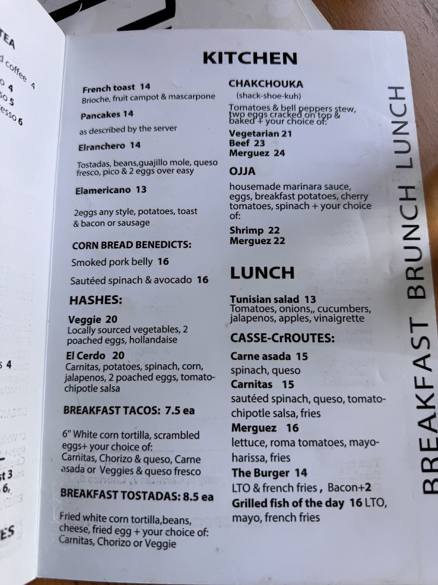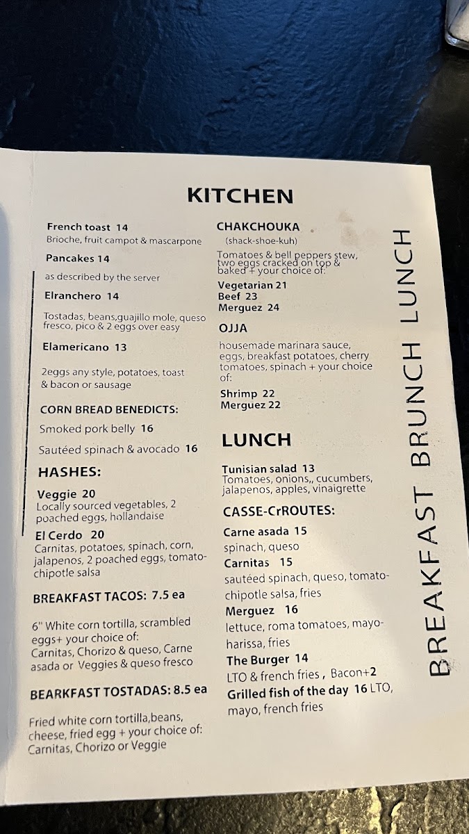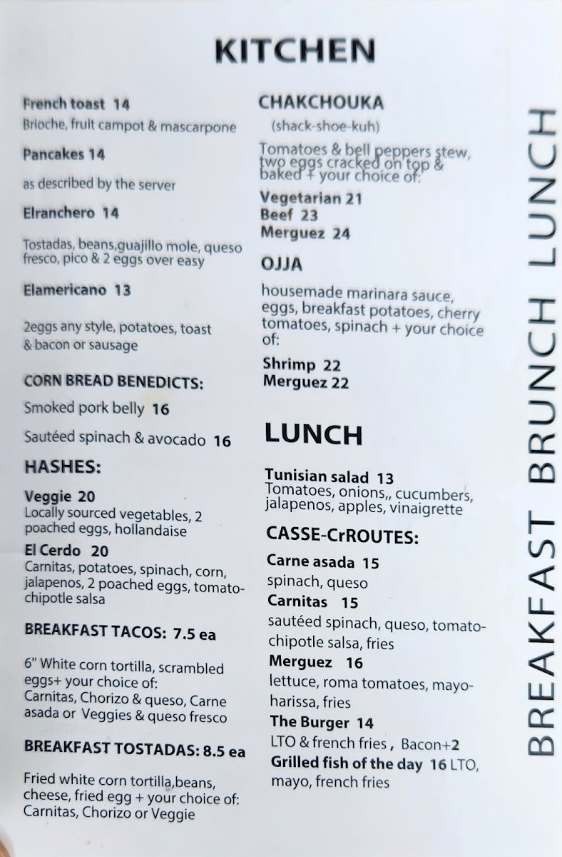 Food options are organized primarily into brunch and lunch selections. The menu includes several types of hashes served with two poached eggs, such as the Elcerdo Hash and Pulled Pork Hash, alongside specialty egg dishes like omelettes and breakfast tacos in different styles, including Chorizo, Carnitas, and Pulled Pork varieties. Other offerings include the Chakchouka—a tomato and bell pepper stew baked with eggs and choice of meats—and sandwiches like the Tunisian-style Cassecroute with options such as Carne Asada, Carnitas, or Merguez sausage. Traditional breakfast items such as French toast and pecan pancakes are also featured.
