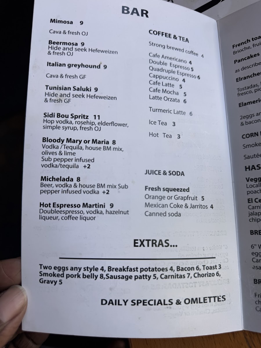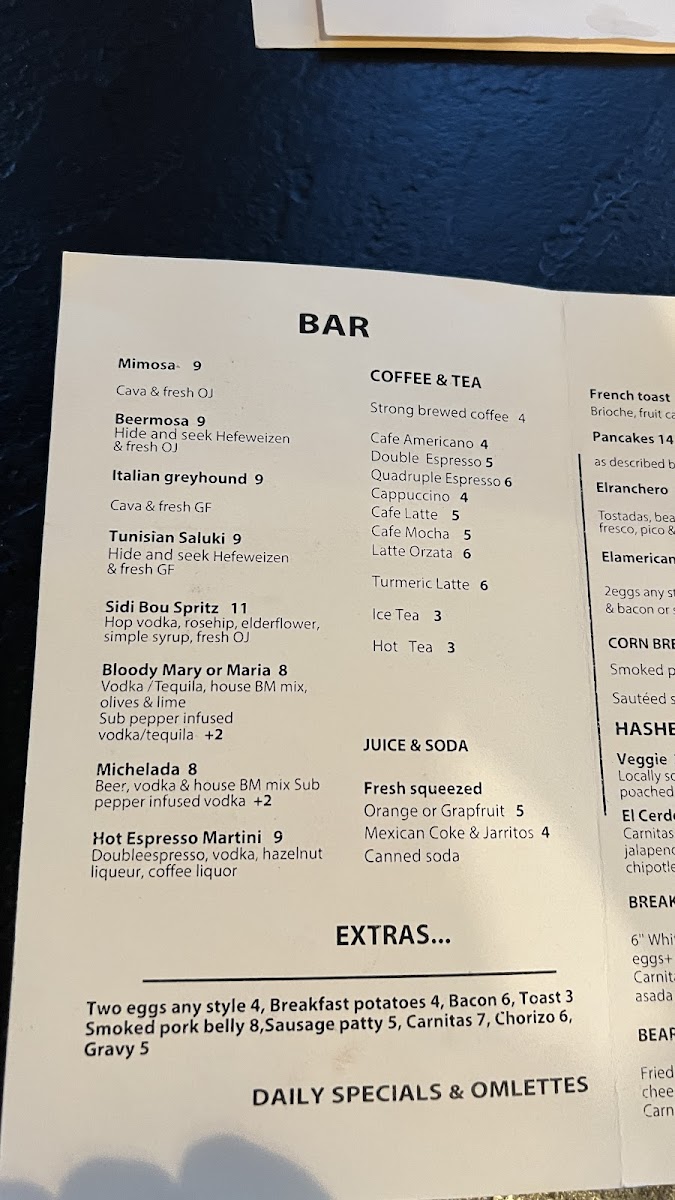 The menu at this location offers a diverse selection suitable for breakfast, brunch, and lunch. It features a variety of coffee drinks, including espresso-based beverages such as lattes with unique flavor additions like honey cinnamon and charcoal powder. Additionally, a range of non-alcoholic drinks is available, including freshly squeezed juices, house-made lemonade, several canned sodas, iced teas, and hot teas.